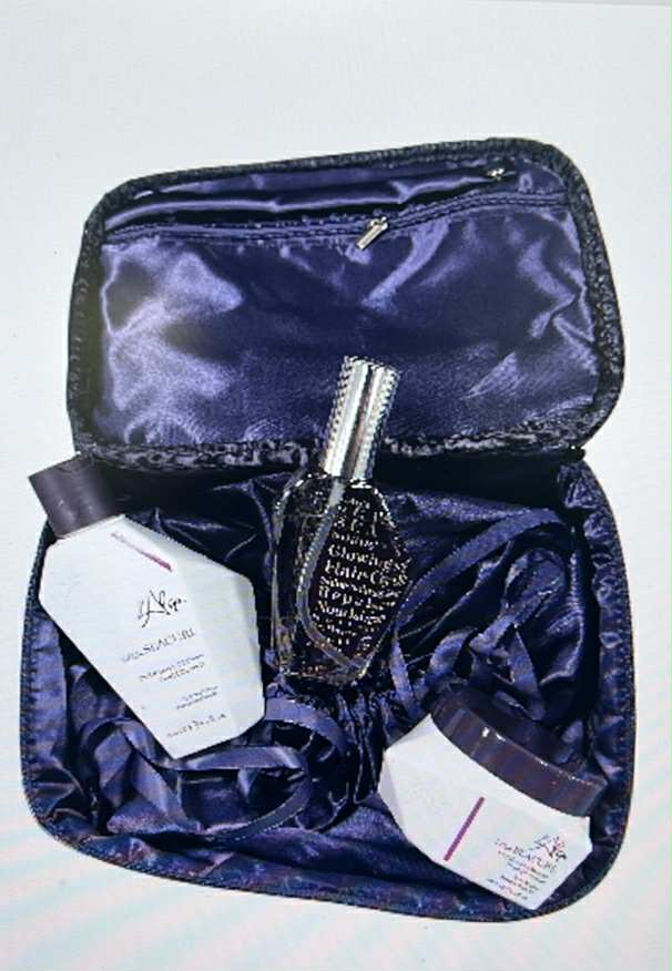 Całość zapakowana jest w elegancką, pikowaną kosmetyczkę w kolorze grafitowym z satynowym wnętrzem.